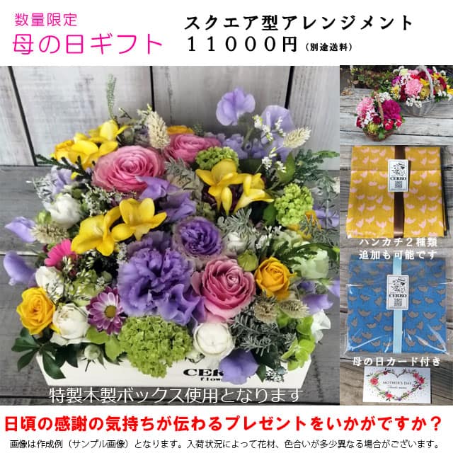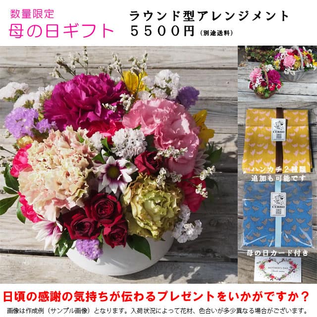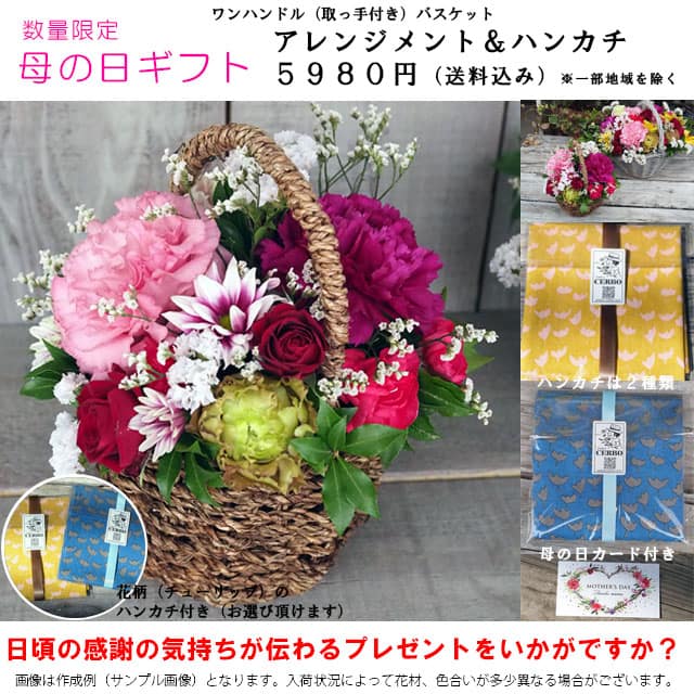 今年は通常アレンジメントに加え、昨年好評のワンハンドルバスケットにお洒落な大判ハンカチをセットしたフラワーギフトをご用意致しました。