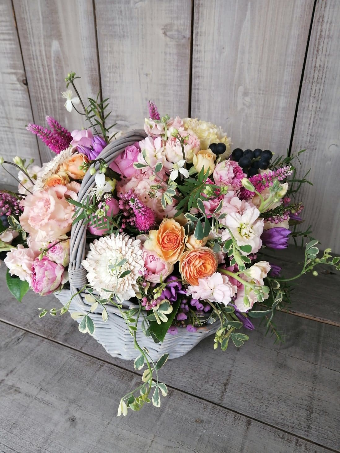 銀座5丁目の銀座ファイブ内のギャラリーにお届けした個展開催御祝いのアレンジメント。取っ手付きの籠のアレンジメントで可愛く。